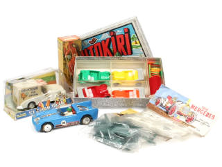 états de 'A+' à 'C' - comprend : MINI-HIWAY RALLY CAR, ICE CREAM TRUCK (pare-brise cassé), MERCEDES 1904 (kit à monter), BENTLEY 1930 (kit à monter) & jeu de société 'AUTOKIRI' (manque un siège - 2 volants en partie cassés) - les boites osnt en état de 'b' & 'c'