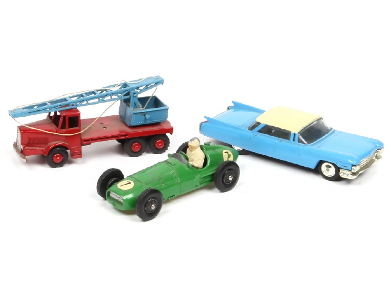 états de 'B' à 'D' - comprend : THORNYCROFT SALVAGE CRANE (avec manques & parties cassées), BRM MK 2 & CADILLAC SEDAN - on y retrouve les marques : LONE STAR, CRESCENT TOY & BUDGIE MODELS