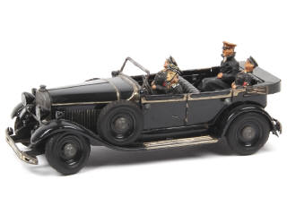 longueur 23 cm - avec moteur à clef (fonctionne), direction, 3 soldats SS (parties repeintes avec une tête non d'origine) & Adolf Hitler (non d'origine) - parties chromées ternies - quelques petits manques par endroits - pneus séchés avec petites déformations