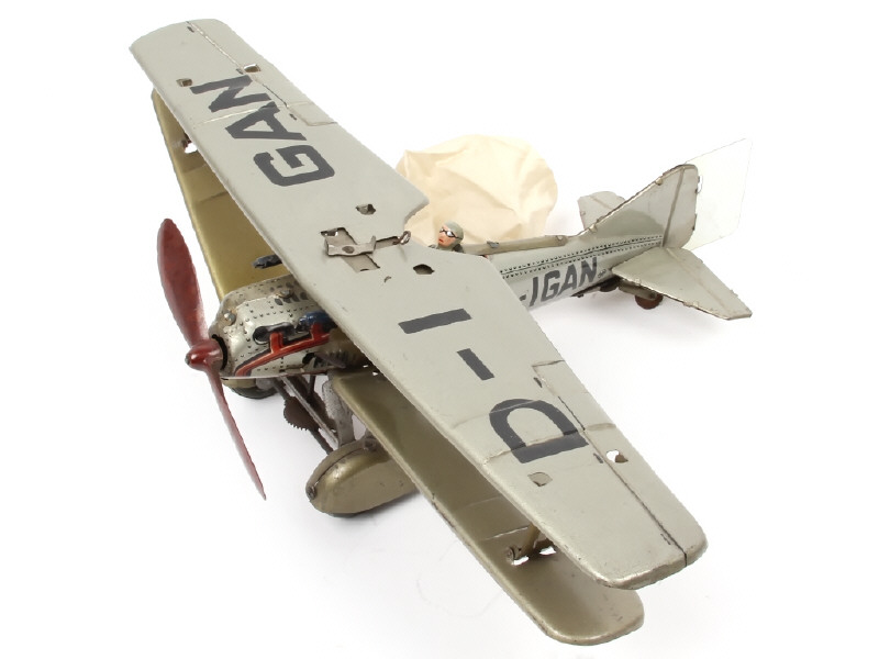 immatriculation : D-I GAN - envergure 37 cm - avec moteur à clef (fonctionne), pilote (repeint) & parachute - en action, l'hélice en bakélite & les roues tournent - traces de vernis d'origine sur quelques parties du modèle - très légères déformations par endroits