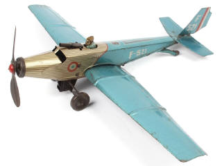 JOUSTRA (FRANCE) Avion monomoteur militaire en tôle lithographiée bleu métal & doré