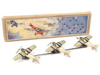 envergure de chaque modèle : 11 cm - mécanisme à clef (fonctionne poussivement) - les modèles peuvent se déplacer de différentes façons grâce à 2 tiges métalliques permettant différents positionnements - boîte tachée avec 2 agrafes manquantes - ensemble légèrement encrassé