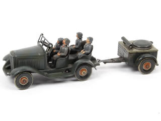 longueur de l'ensemble : 28 cm - avec moteur à clef (à revoir), direction & 4 soldats de la Luftwaffe - couvercle de marmite non d'origine - manque fermeture de trappe de foyer - quelques petits frottements par endroits