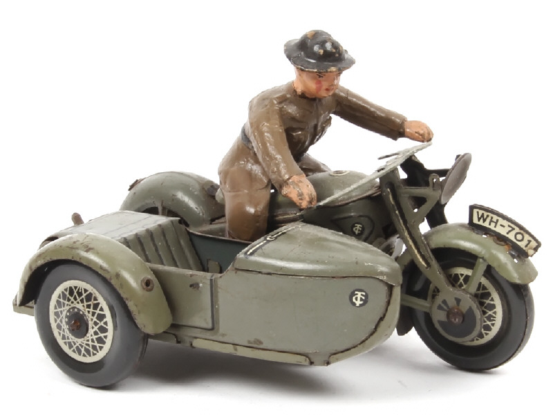 longueur : 13 cm - avec moteur à clef (fonctionne), direction & pilote britannique (non conforme, avec restaurations) - guidon non d'origine - petites traces d'oxydation par endroits