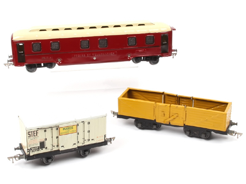 légers frottements sur la carrosserie par endroits - on y joint un wagon tombereau (état 'C') & fourgon STEF de la marque - quelques traces d'humidité sur les roues & les tampons