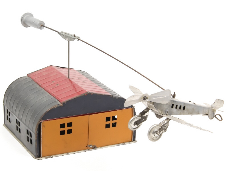 dimensions : 52 X 21 X 23 cm - moteur à ressort (fonctionne poussivement) - en action, l'avion tourne autour du hangar grâce à une perche équipée d'un contrepoids (repeint) - traces d'oxydation plus ou moins importantes par endroits (principalement sous le plancher)