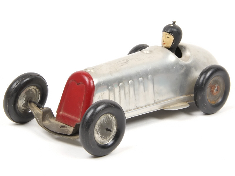 longueur : 21 cm - avec moteur à inertie (à revoir) & direction actionnée par le tête du pilote - quelques parties ternies - petites restaurations sur les fixations de roues arrière