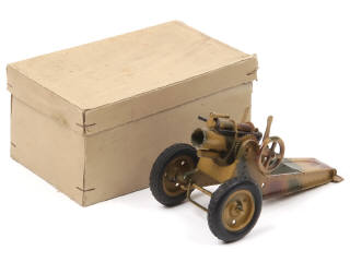 longueur : 13,5 cm - sans obus - avec système à amorces (fonctionne) & molette d'inclinaison du tube (quelques petits manques de peinture par endroits) - une petite annotation sur la boîte