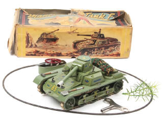 longueur 20 cm - avec moteur à clef (fonctionne), télécommande directionnelle avec câble (à revoir, quelques éclats majeurs), notice & clef