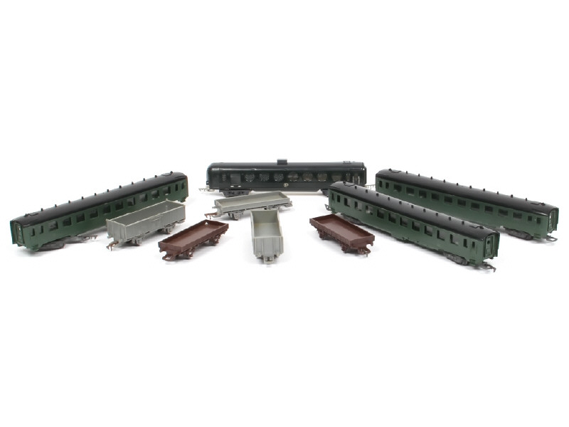 réalisation en plastique & métal - comprend : wagons-marchandises & voitures-voyageurs - possibilités de manques & parties cassées - traces d'oxydation