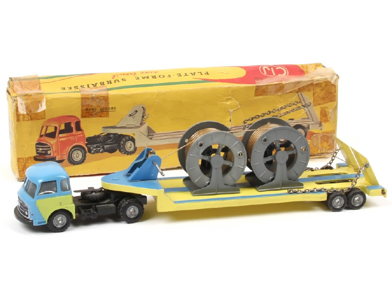 C.I.J. (FRANCE) 4/75 SAVIEM LRS Semi-remorque surbaissée porte-bobines de câble bleu & jaune vert
