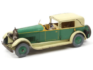 longueur : 45 cm - avec moteur à clef (à revoir), direction par le volant, phares électriques (non testés), portière ouvrante & chauffeur (avec éclats plus ou moins importants) - quelques petites restaurations avec retouches plus ou moins importantes & petits éléments non d'origine avec d'autres manquants - traces d'oxydation - BEL ETAT DE PRESENTATION POUR UN MODELE AUSSI RARE !
