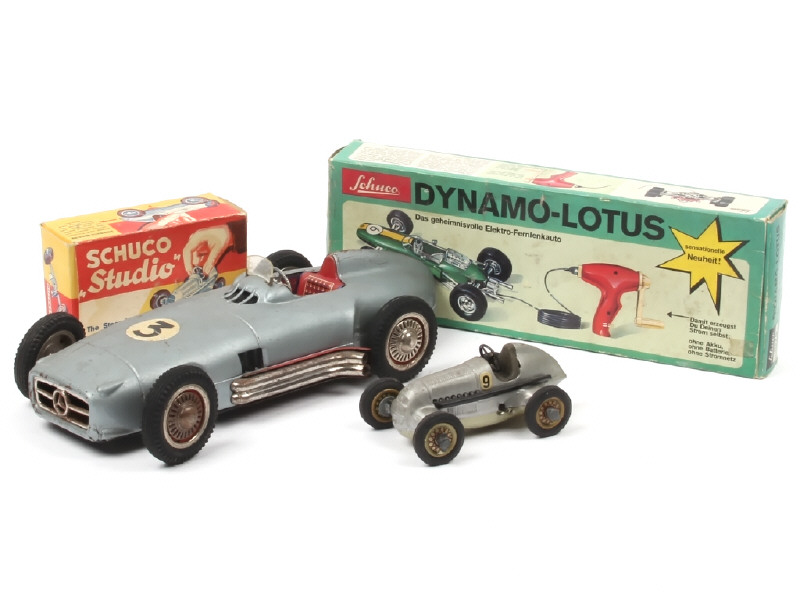 états de 'B' à 'D' - échelles différentes - motorisés (2 moteurs fonctionnent) - comprend : 2 MERCEDES & une LOTUS - on y retrouve les marques : JNF & SCHUCO (un exemplaire avec accessoires & notice) - 2 exemplaires en boîte (états 'c' & 'd') - carrosserie plus ou moins encrassées - quelques traces d'oxydation - possibilité de petits accessoires manquants