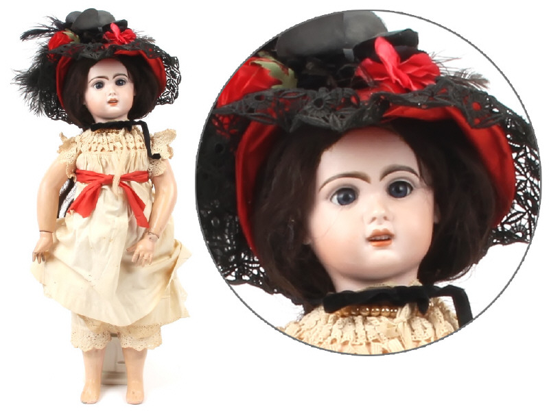 taille 8 (56 cm environ) - tête en biscuit (sans fêle apparent) - marquage 8 en creux à la nuque - yeux bleus dormeurs en sulfure (éclats sur les paupières) - corps en composition (quelques éclats) - vêtements et chapeau ancien