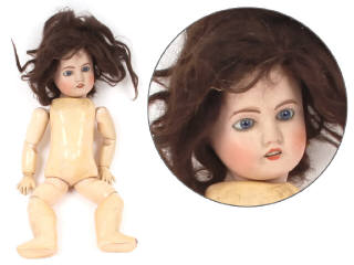 hauteur : 28 cm environ - marquages 2 sous les pieds, la tête & entre les omoplates (FRANCE lisible sur la nuque) - tête en biscuit (sans fêle apparent) - yeux bleus fixes - corps articulé en composition (quelques rares éclats) - perruque brune en mohair & calotte d'origine