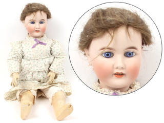 taille 12 (72 cm environ) - tête en biscuit (sans fêle apparent) - marquage '33 MON TRESOR 12' - yeux bleus en sulfure fixes (fêles dans un oeil) - oreilles percées - bouche ouverte sur une rangée de dents - corps en composition (quelques éclats & petites fissures) - sans calotte - perruque & vêtements anciens