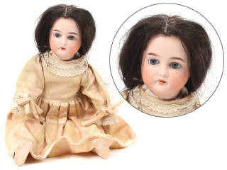 taille : 40 cm environ - tête en biscuit (sans fêle apparent) - marquage '1910 GERMANY 2/0' - yeux bleus en sulfure fixes (anciennement dormeurs mais mécanisme bloqué avec du plâtre) - corps en composition (repeint, avec éclats majeurs) - perruque & calotte non d'origine - vêtements anciens