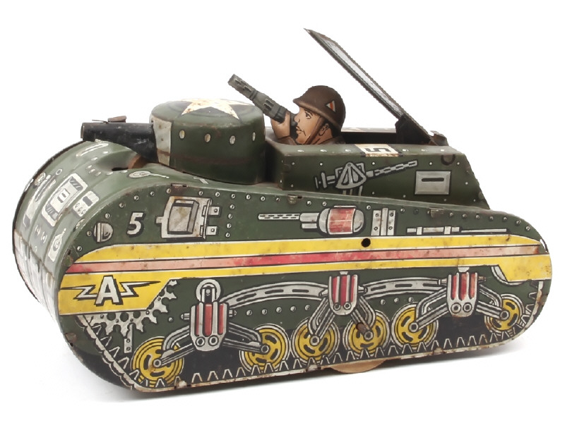 longueur : 25,5 cm - avec moteur à clef (fonctionne) & direction - en action, le char avance tandis qu'un soldat sort puis entre à nouveau à l'intérieur de celui-ci - traces d'oxydation plus ou moins importantes par endroits (dont certaines majeures)