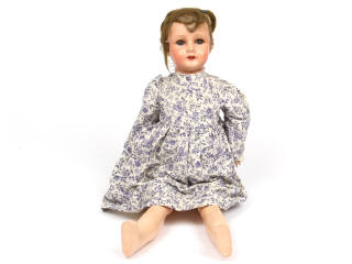 Taille 9 (55 cm environ) - tête en composition, yeux bleus dormeurs, bouche ouverte sur une rangée de dents - péruque en mohair incomplète - 9 en creux sur la nuque & sous les pieds - corps en composition (quelques éclats) avec mécanisme bruiteur (à revoir) - robe ancienne