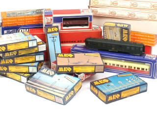 non testé - états de 'A' à 'C' - comprend : voitures de voyageurs, wagons de marchandises & accessoires à monter - quelques boîtes en état 'c' - on y retrouve les marques : CEMP, RMA, MKD & JOUEF - possibilité de petits accessoires manquants & cassés