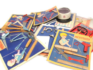présentés sur planches cartonnées (plus ou moins déchirées) - on y joint 2 panoplies (dont une d'agent de la circulation) - possibilité de petits accessoires manquants