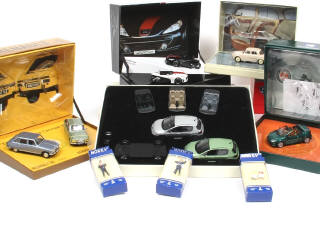 on y retrouve les modèles : PEUGEOT 307 (2 exemplaires en coffret avec 2 planchers manquants), H²O, 206 CC 'ROLAND GARROS', 20 CUP (édition limitée 1835/2000 exemplaires), RENAULT DAUPHINE & 16 - on y joint 2 agents de police & 2 bornes kilométriques de la marque