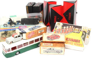 miniatures reproduisant notamment les modèles : SAVIEM (sans boite), CITROEN (5 séries limitées), FORD 'AMBULANCE' (production originale - carrosserie légèrement déformée), RENAULT (un modèle de production récente), MERCEDES & PEUGEOT (production récente) & 4 motocyclistes - on y joint un îlot pompes à essence avec pompiste & un coffret contenant 6 panneaux de signalisation en agent de la circulation & îlot) - quelques pneus plus ou moins craquelés