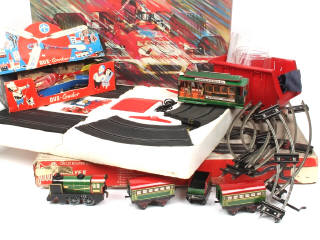 non testé - états de 'B' à 'C' - comprend : hélicoptère à propulsion CONDOR, 2 coffrets de circuit routier (référence 3029 & 3040), locomotive à vapeur fonctionne) avec tender, 2 voitures-voyageurs & 6 rails courbe & tramway en tôle lithographié - on y retrouve notamment les marques : JOUEF, HORNBY (FRANCE) & DUX - quelques traces d'oxydation - possibilité de petits manques
