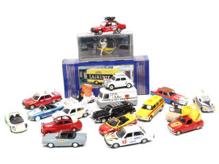 états de 'A+' à 'B' - miniatures reproduisant notamment les modèles : RENAULT, CITROËN, PEUGEOT & SIMCA - 2 exemplaires en boîte (état 'b') - on y joint un VOLVO fourgon 'LAJAUNIE' - carrosseries plus ou moins encrassées avec petits manques & parties cassées