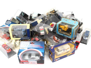 miniatures reproduisant notamment les modèles : DODGE, CITROEN, FIAT, RENAULT, PEUGEOT, LAND ROVER & ASTON MARTIN - on y retrouve notamment les marques : SOLIDO, CORGI TOYS & VITESSE - quelques petits accessoires manquants - certains modèles sans boite