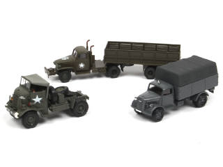 comprend : FEDERAL tracteur routier (pare-brise à repositionner), GMC semi-remorque à ridelles & OPEL BLITZ bâché - on y retrouve les marques : PARADE, SOLIDO (modèle transformé sur base) & MINITRUCK