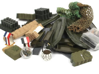 différentes compositions - états de 'A' à 'R' - comprend notamment : éléments de pont, cannots pneumatiques, filets de camouflage, caisses, fûts & roues - petites transformations avec quelques exemplaires copies - on y retrouve notamment les marques : DINKY TOYS & STARLUX