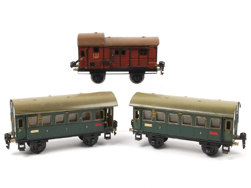 comprend : 2 voitures voyageurs de 2ème classe & fourgon à bestiaux - quelques frottements & éclats - vitrages encrassés & mal positionnés