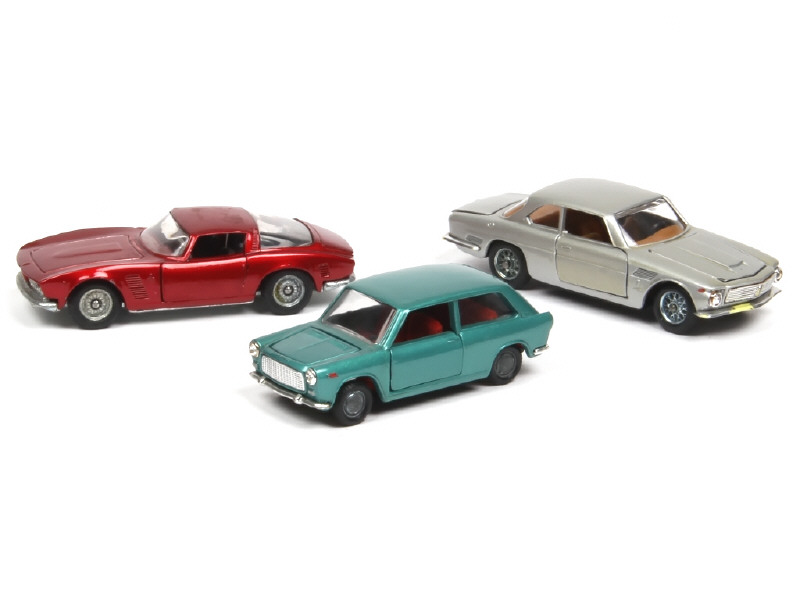 comprend les modèles : AUTOBIANCHI PRIMULA (manque autocollant de plaque minéralogique), ISO RIVOLTA (2 décalques ajoutés) & GRIFO - quelques parties plus ou moins ternies avec petits manques de pellicule chromée par endroits