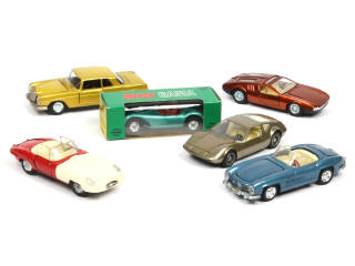 miniatures reproduisant les modèles : JAGUAR (en état 'R'), MERCEDES (2 exemplaires différents), MONTEVERDI, DE TOMASO & FERRARI (en boite état 'b') - on y retrouve les marques : JOAL, PILEN & GAMA - quelques petits éléments manquants
