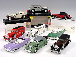 modèles reproduisant les marques : CADILLAC, DELAHAYE, PACKARD, DUESENBERG & DELAGE - 3 modèles avec boîte
