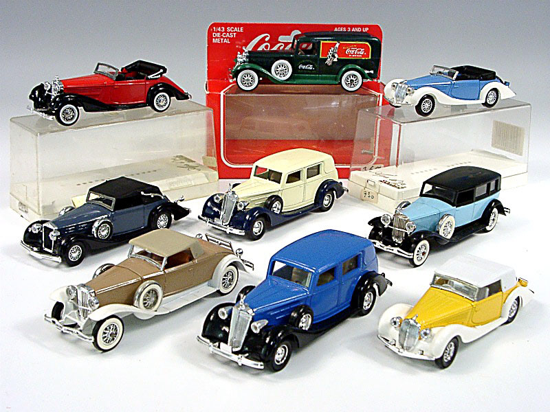 modèles reproduisant les marques : CADILLAC, DELAHAYE, MERCEDES, PACKARD, DUESENBERG & DELAGE - 3 modèles avec boîte - manque insigne de calandre