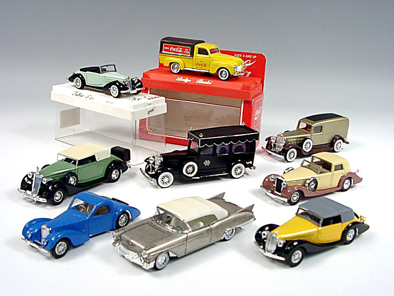 modèles reproduisant les marques : CADILLAC, DELAHAYE, PACKARD, DELAGE, DODGE, BUGATTI & TALBOT - 2 modèles avec boîte