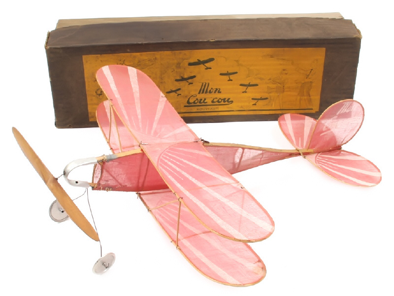 réalisation en balsa, aluminium & tissu - envergure : 37 cm - propultion par élastiques (détachés) - quelques fixations plus ou moins défectueuses - boîte salie