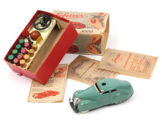 contient : une voiture aérodynamique avec moteur à clef (fonctionne - petits frottements sur le plancher), 12 plots dont 2 avec panneaux 'SCHUCO', une bille en bois, 2 câbles de guidage à distance sous sachet, une clef, notice & un volant de téléguidage - fabrication originale