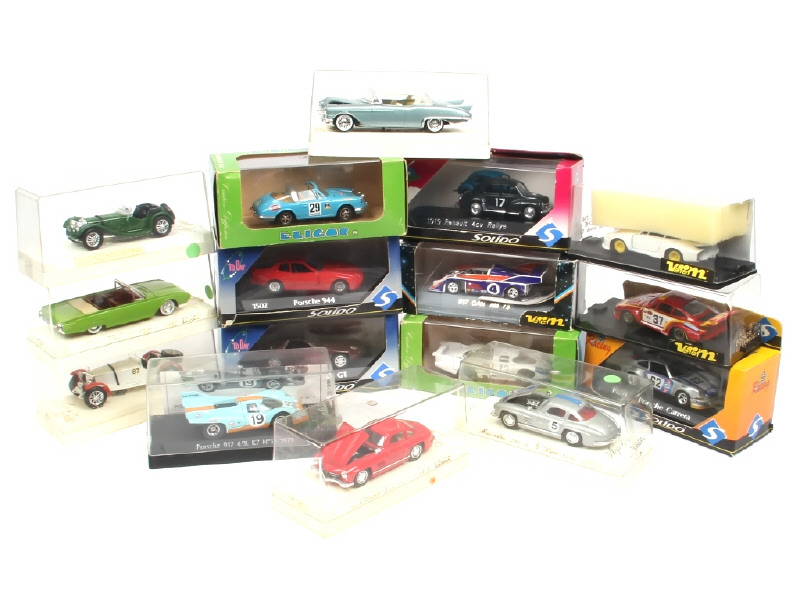 miniatures reproduisant les modèles : FORD, CADILLAC, PORSCHE, MERCEDES (petits manques de pellicule chromée) & JAGUAR - on y retrouve les marques : VEREM, SOLIDO, ELIGOR - accrocs plus ou moins importants sur les suremballages (une boite en état 'c'