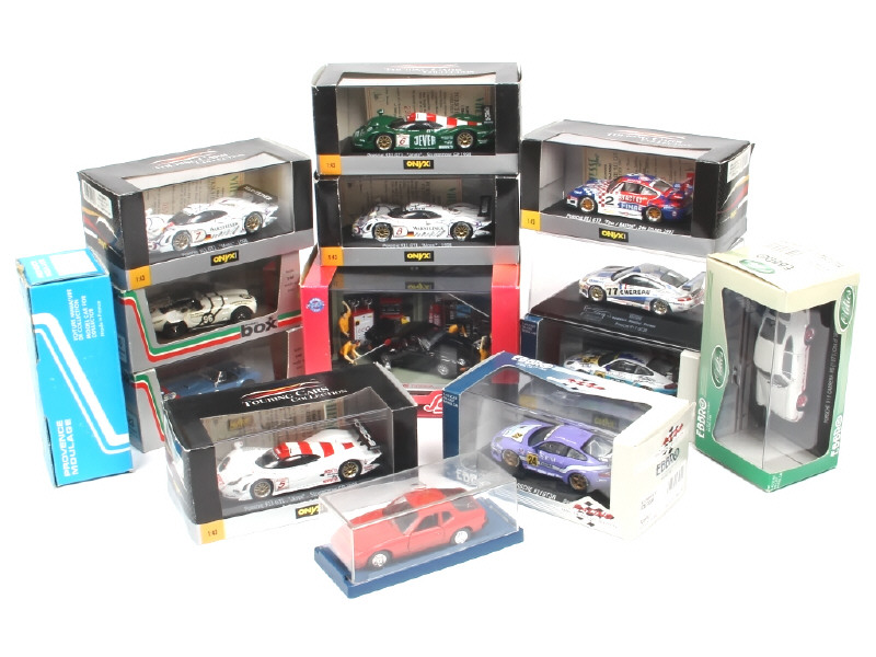 miniatures reproduisant notamment les modèles : PORSCHE, SHELBY & RENAULT - on y retrouve les marques : MODEL BOX, SCHUCO, EBBRO, ONYX & PROVENCE MOULAGE (un rétroviseur à recoller)