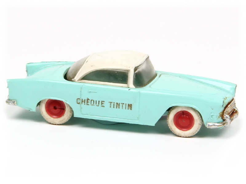 la mention 'CHEQUE TINTIN' est gravée en lettres dorées sur le côté droit de la carrosserie (légèrement déformée) - ce modèle promotionnel pouvait être obtenu en échange de points que l'on trouvait à l'époque dans le journal de TINTIN - trace de colle sur la calandre - manque une extrémité de pare-chocs avant & phares - jantes plus ou moins fendues
