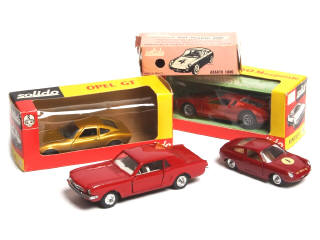 comprend : ABARTH 1000 (boite en état 'c'), OPEL GT (sans cale de boite), DE TOMASO MANGOUSTE (blister légèrement déchiré) & FORD MUSTANG (état 'B' - système éléctrique non testé - sans boite)