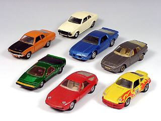 miniatures reproduisant les marques : PORSCHE, CHEVROLET, OPEL, CARABO BERTONE & TOYOTA - un modèle avec détails de peinture ajoutés