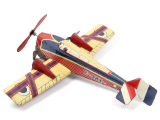 envergure : 50 cm - moteur à ressort (fonctionne poussivement) - quelques parties ternies avec traces d'oxydation plus ou moins importantes - fixation d'hélice centrale recollée avec une agrafe manquante - petites déformation & rayures par endroits