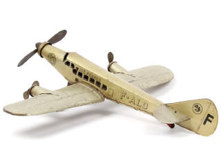 immatriculation : F-ALO - envergure : 66 cm - moteur à clef (fonctionne) - traces d'oxydation avec parties ternies plus ou moins importantes par endroits - manque une agrafe