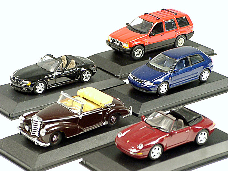 miniatures reproduisant les marques : AUDI, MERCEDES, JEEP, PORSCHE & BMW - avec 4 suremballages carton