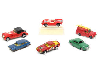 petite échelle - états de 'A' à 'B' - miniatures reproduisant les modèles : FORD (2 exemplaires différents), ROVER, LOLA, AUSTIN HEALEY (petits détails de peinture ajoutés) & MORGAN - on y retrouve les marques : HUSKY, CHAMPION (en boite état 'c'), MAJORETTE, CORGI TOYS & BUDGIE