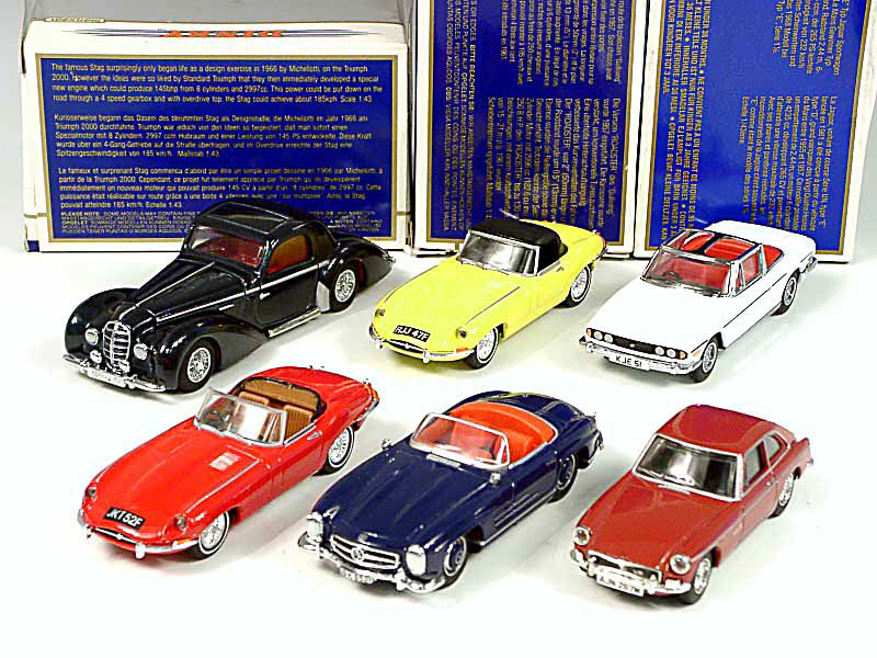 miniatures reproduisant les marques : JAGUAR, TRIUMPH, MG, MERCEDES & DELAHAYE - 3 modèles avec boîte